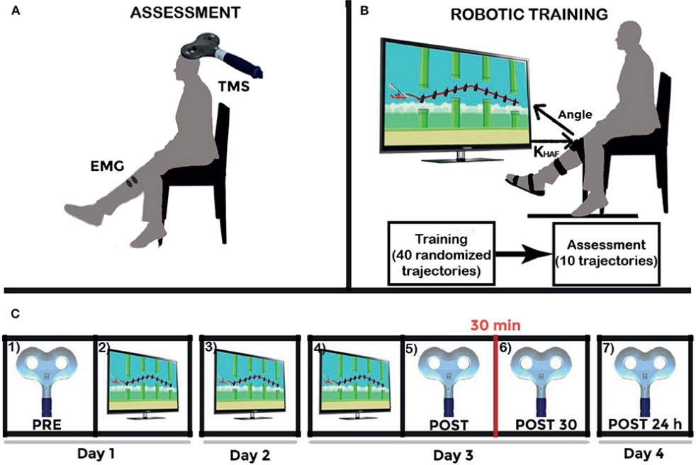 Reclutamos diez personas sanas y un paciente para este estudio para un protocolo piloto de intervención que incluía la realización de movimientos del tobillo siguiendo diferentes trayectorias con un videojuego. El sistema modulaba de forma autónoma la dificultad de la tarea según la puntuación obtenida en el videojuego para aumentar el desafío. La hipótesis era que el aprendizaje motor durante las sesiones de entrenamiento conduciría a un aumento de la excitabilidad corticoespinal correspondiente los músculos dorsiplantaroflexores, evaluada por medio de estimulación magnética transcraneal.