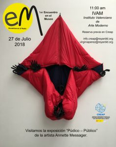 En este primer encuentro, que se inicia el viernes 27 de julio, visitaremos la exposición Púdico-Público de la artista francesa Annette Messager, acogida por el IVAM, Instituto Valenciano de Arte Moderno. Después de la visita contaremos con un café tertulia sobre la obra de la artista en el barrio del Carmen. Contamos con la colaboración y participación de ASIEM en esta visita tan especial.