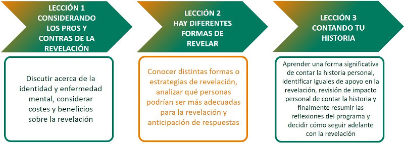 Los contenidos del programa se estructuran en lecciones y tareas distribuidas en objetivos de aprendizaje, preguntas de discusión y ejercicios en grupo. La persona moderadora se asegura de que los objetivos de cada lección han sido explicados y comprendidos antes de iniciar las actividades. Se asegurará también de facilitar la participación de todo el grupo y que se cumplen las reglas básicas. Se trata de generar un espacio en el que las personas participantes sientan que pueden compartir opiniones y sentimientos si es su deseo hacerlo.