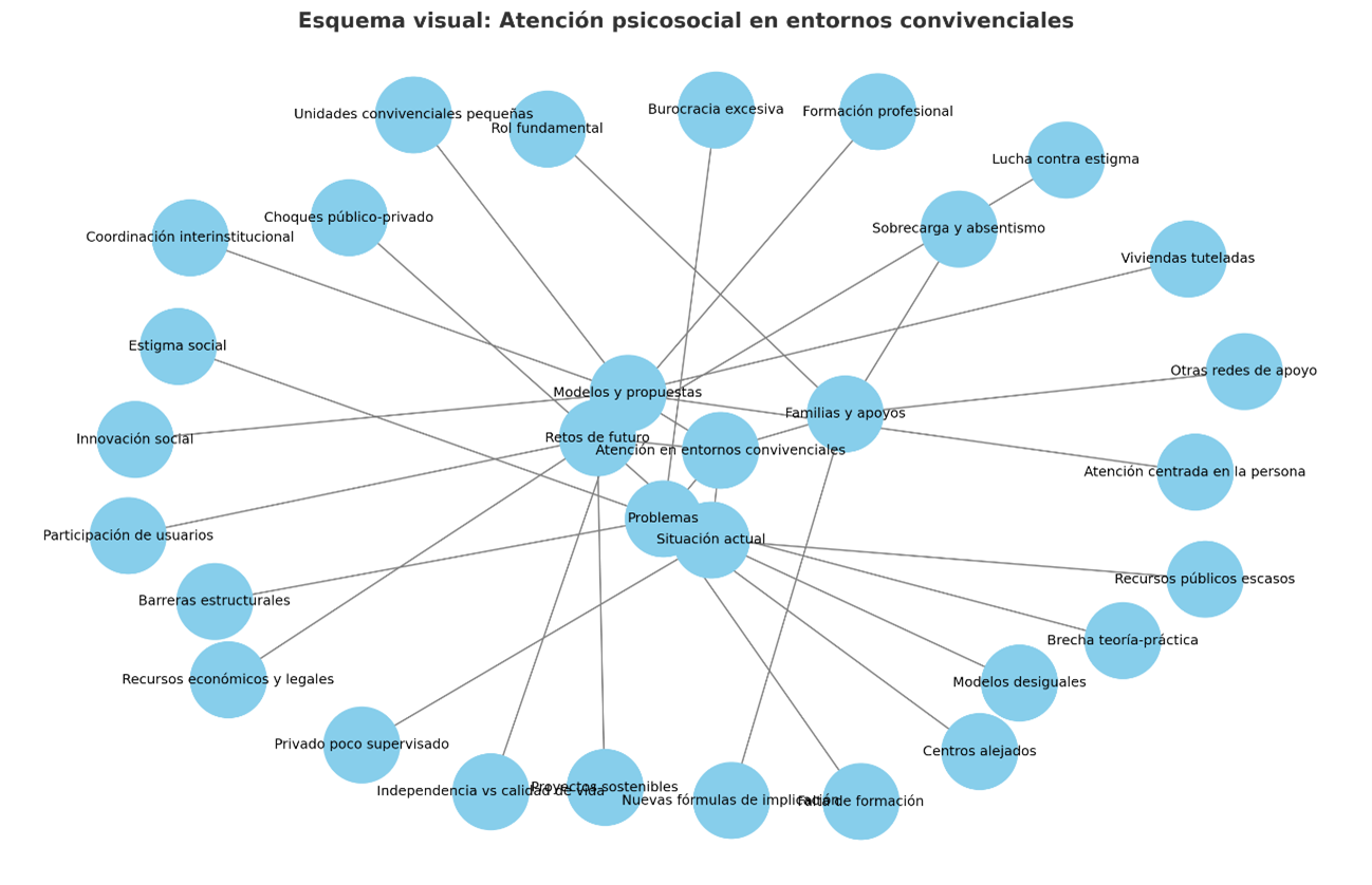 La sesión giró en torno a la situación actual de la atención psicosocial en recursos convivenciales —como viviendas tuteladas, residencias y otros dispositivos comunitarios— y a los retos que afronta el sistema en la actualidad.
