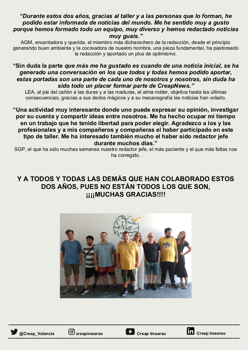 Durante estos 2 últimos años, cada semana se ha llevado a cabo este taller y el equipo de redacción de «Creap News» ha difundido noticias de actualidad política, científica, social, tanto de ámbito nacional como internacional.