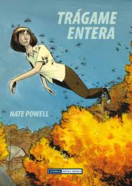 Trágame entera es una historia de amor conducida por una niebla ondeante, por una enfermedad terminal, alucinaciones, ejércitos de insectos, secretos, fe inquebrantable y la búsqueda de un patrón clave para desenmarañar el lío de uno mismo. En su más ambiciosa obra hasta la fecha, Nate Powell explora los recodos más oscuros de la adolescencia, los incontables pequeños momentos de locura, el vago alivio que provee la medicación y las ventajas y desventajas de los lazos familiares. A medida que avanza la historia, dos hermanastros navegan juntos a través de la esquizofrenia, el trastorno obsesivo compulsivo, la descomposición familiar, la telepatía animal, el amor fallido y la leve esperanza de que algún día todo cobre sentido. Con un tempo deliberadamente pausado y delicadamente dibujada, Trágame entera fue ganadora del Premio Ignatz “Al más destacado debut” de 2008.