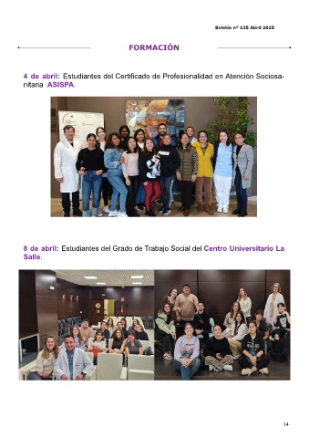 Boletín nº 135 Abril 2025 FORMACIÓN 4 de abril: Estudiantes del Certificado de Profesionalidad en Atención Sociosa- nitaria ASISPA. 8 de abril: Estudiantes del Grado de Trabajo Social del Centro Universitario La Salle. 14