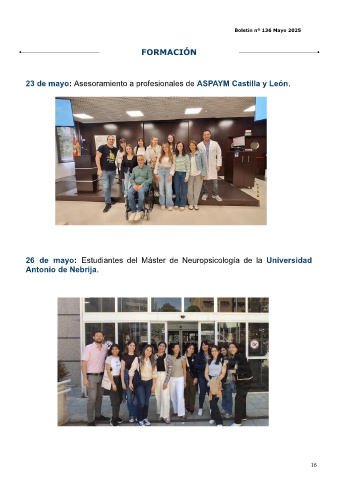 Boletín nº 136 Mayo 2025 FORMACIÓN 23 de mayo: Asesoramiento a profesionales de ASPAYM Castilla y León. 26 de mayo: Estudiantes del Máster de Neuropsicología de la Universidad Antonio de Nebrija. 16
