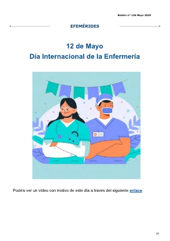 Boletín nº 136 Mayo 2025 EFEMÉRIDES 12 de Mayo Día Internacional de la Enfermería Podéis ver un vídeo con motivo de este día a través del siguiente enlace. 18