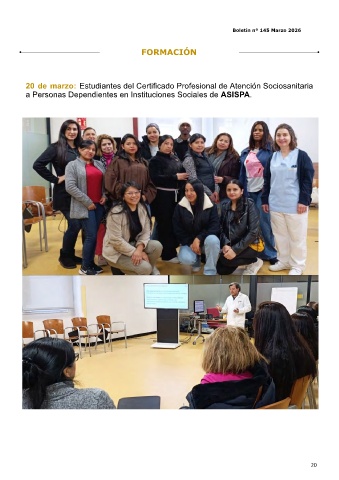 Boletín nº 145 Marzo 2026 FORMACIÓN 20 de marzo: Estudiantes del Certificado Profesional de Atención Sociosanitaria a Personas Dependientes en Instituciones Sociales de ASISPA. 20