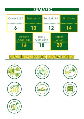 SUMARIO Conecta2.0 Territorio IN Territorio EX Sin Límites 6 10 12 14 Deporte Leer y Tablón Adaptado Compartir CRMF 16 18 20 ¡DESCUBRE NUESTROS NUEVOS ICONOS!