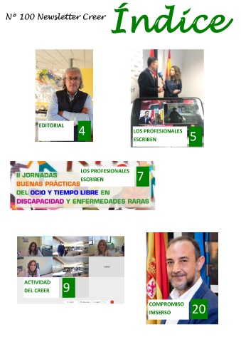 Índice Nº 100 Newsletter Creer EDITORIAL 4 LOS PROFESIONALES ESCRIBEN 5 LOS PROFESIONALES ESCRIBEN 7 ACTIVIDAD DEL CREER 9 COMPROMISO IMSERSO 20 Newsletter Creer Nº 100 / 2