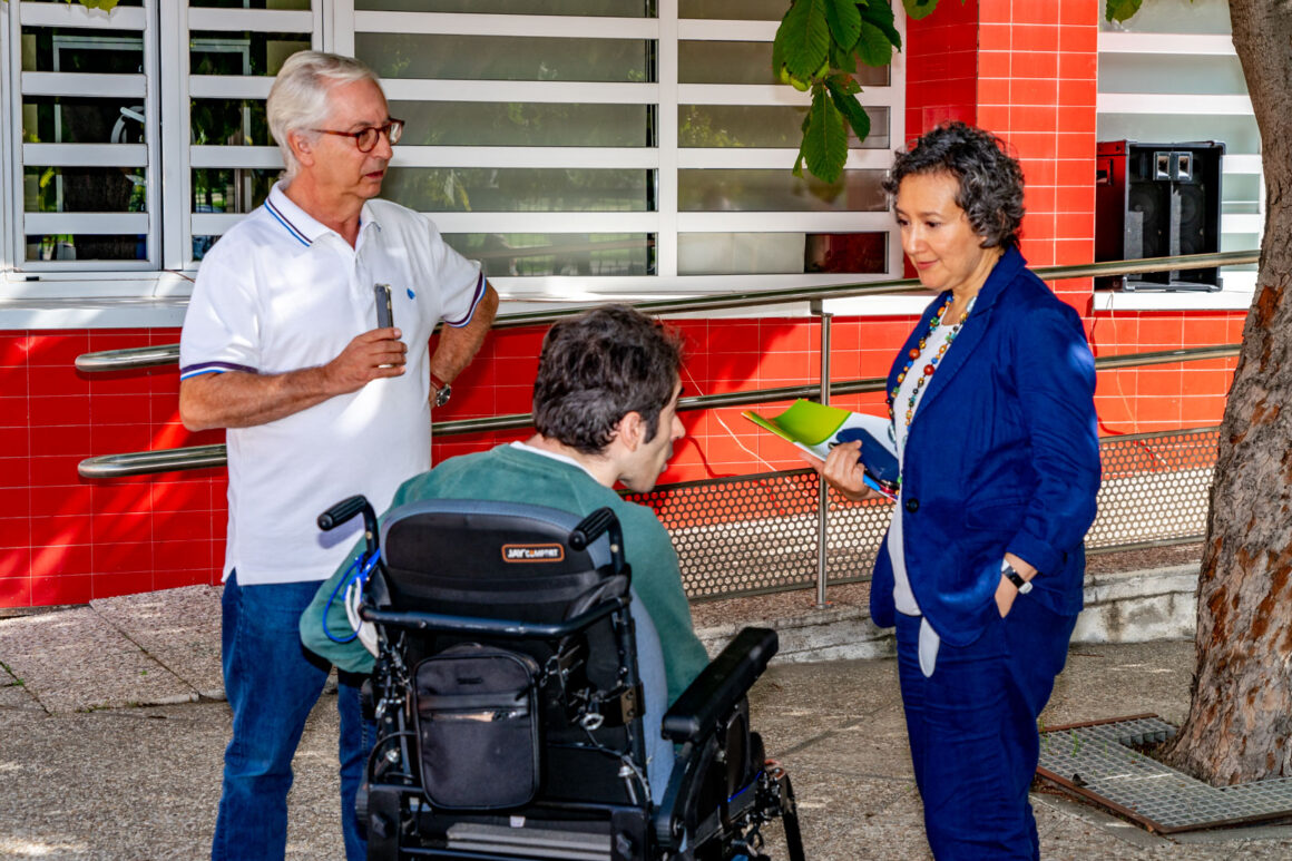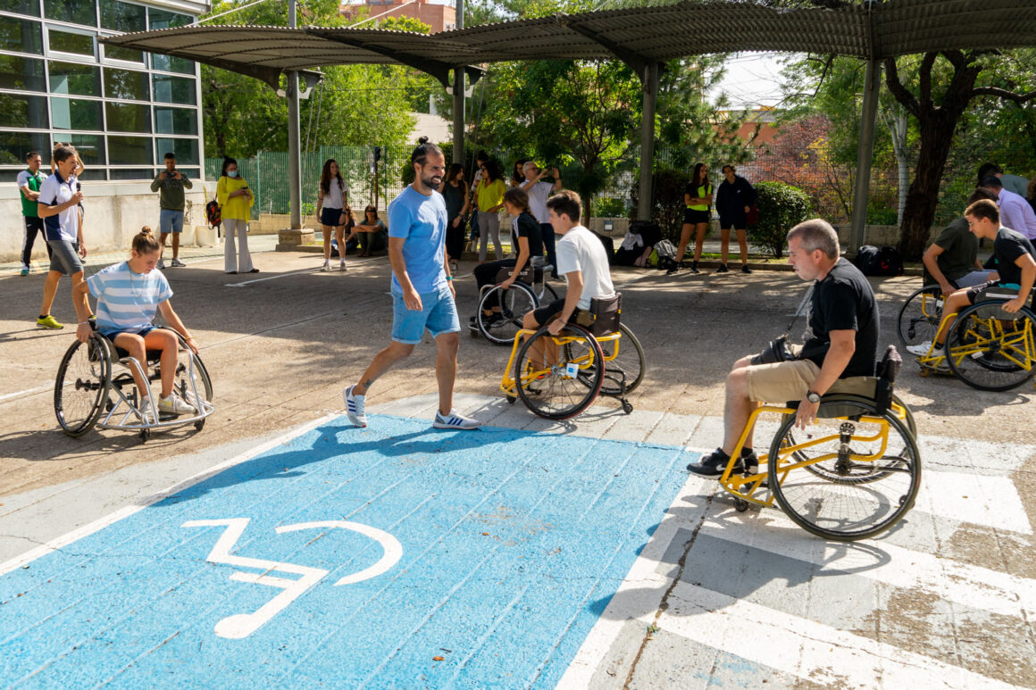 La jornada tuvo una primera práctica en el exterior de las instalaciones del Ceapat con Javier Pérez y sus alumnos de la Escuela de Doctorado y del Grado de Ciencias del Deporte de la UPM. Javier explicó las partes de la silla de ruedas para el deporte; analizó el chasis, los asientos, los respaldos, la angulación de las ruedas posición de las mismas variando el eje de las ruedas y su autopropulsión adecuada para sacar el máximo rendimiento en el desplazamiento y para el objetivo deportivo protegiendo al máximo los hombros.