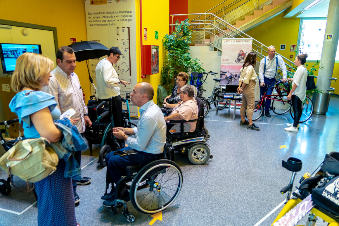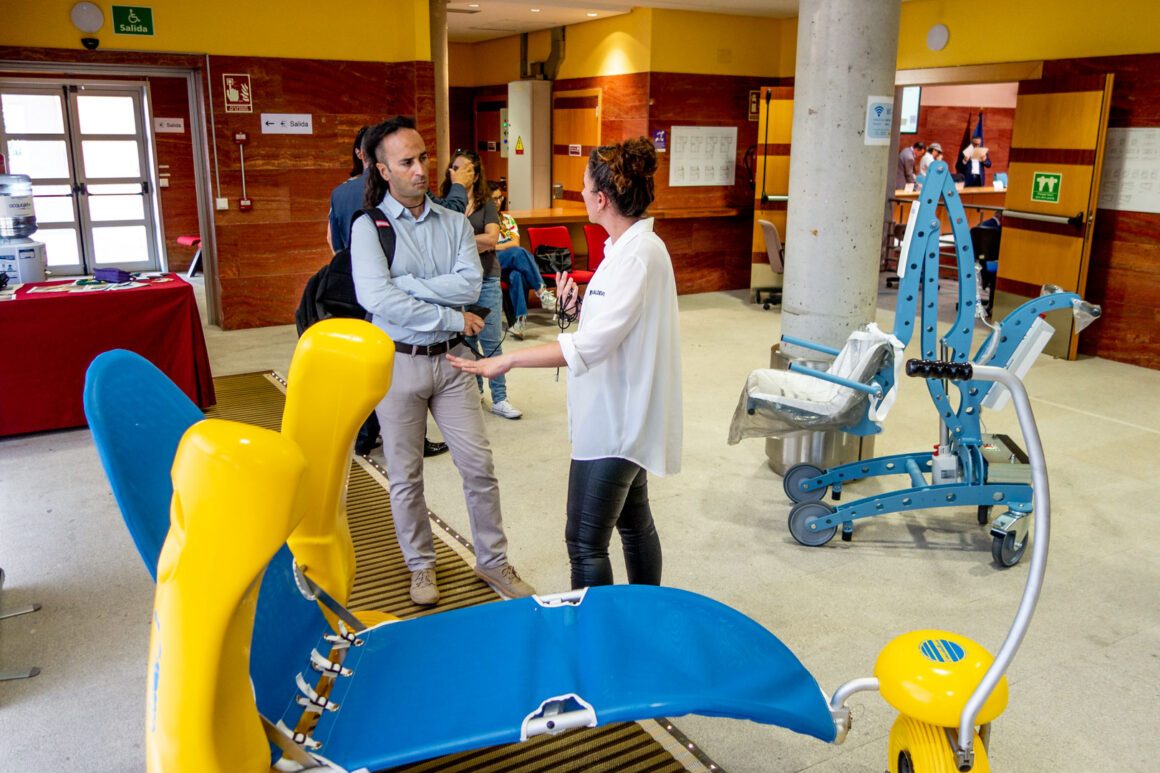 Antes de volver al salón de actos tuvimos la oportunidad de ver y probar numerosos productos de apoyo para la práctica del deporte para personas con discapacidad. Estos productos se encontraban en diferentes estands a cargo de las empresas: Winncare Spain, Sunrise Medical S.L., Fundación También, Rollzing, Rodem Ortotec S.L., Novaf Andalucía 2007, S.L., Kaldevi Ingeniería Geriatrica, S.L., Federación Española de Deportes para Ciegos y Federación de Deportes de Montaña y Senderismo de Castilla y León.