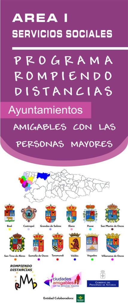 Los doce municipios del occidente asturiano que en 2016 se adhirieron inicialmente a esta Red mundial lo hicieron de manera simultánea, y son Valdés, Boal, Illano, Pesoz, Grandas de Salime, Castropol, Vegadeo, Taramundi, San Tirso de Abres, Santa Eulalia de Oscos, San Martín de Oscos y Villanueva de Oscos donde están implantados servicios y actividades que se llevan a cabo desde el programa de envejecimiento activo asentado en el territorio con el Programa Rompiendo Distancias. Este Programa se ha utilizado como paraguas bajo el que se cobija la propuesta del Equipo Territorial de Servicios Sociales del Principado que, una vez conocida la iniciativa de la OMS, consideró que quienes participaban desde hace tantos años en las actividades del Programa Rompiendo Distancias podían ser los mismos equipos y personas que colaboraran en configurar un territorio rural amigable con las personas mayores utilizando el Programa Rompiendo Distancias como canal de participación, trabajando en un proceso de investigación en la acción de recogida de datos y opiniones.