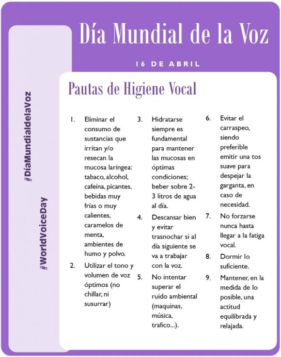 El pasado domingo 16 de abril se ha celebrado el Día Mundial de la Voz. Aprovecho la ocasión para sensibilizar sobre los hábitos que debemos tener en cuenta para el cuidado de nuestra voz.